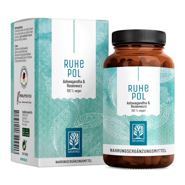 nDer Ruhepol Anti-Stress Komplex mit 120 veganen Kapseln kombiniert Ashwagandha und Rhodiola Rosea für innere Balance. Er wird sorgfältig in Deutschland hergestellt, ist frei von unerwünschten Zusätzen und von unabhängigen Laboren geprüft. Genieße die Gewissheit einer 30-tägigen Rückgabe bei Unzufriedenheit.